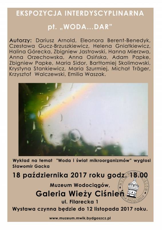 GALERIA WIEŻY CIŚNIEŃ, MUZEUM WODOCIĄGÓW zaprasza 18. października 2017 r. o godz.18.00 na otwarcie wystawy zbiorowej, interdyscyplinarnej: "Woda...Dar".